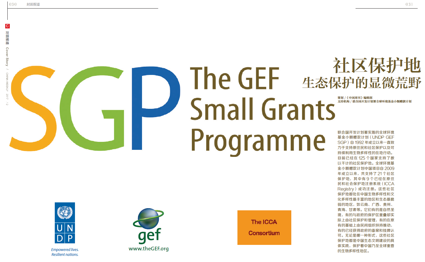 《中國(guó)周刊》于2017年12月刊登題為《社區(qū)保護(hù)地》的封面故事,報(bào)道聯(lián)合國(guó)開發(fā)計(jì)劃署全球環(huán)境基金小額贈(zèng)款計(jì)劃(UNDP GEF SGP)支持的社區(qū)保護(hù)地。全球環(huán)境基金小額贈(zèng)款中國(guó)項(xiàng)目國(guó)家協(xié)調(diào)員劉怡在開篇《社區(qū)保護(hù)地 地球上最古老的保護(hù)地模式》一文中詳細(xì)介紹了原住民和社區(qū)保護(hù)地(ICCA)在全球的狀況、相關(guān)國(guó)際政策以及面臨的機(jī)遇與挑戰(zhàn),并呼吁政府及全社會(huì)對(duì)原住民和社區(qū)保護(hù)地進(jìn)行恰當(dāng)?shù)恼J(rèn)可。本期封面故事還報(bào)道了包括“三江并流地區(qū)河源村社區(qū)保護(hù)地建設(shè)及社區(qū)可持續(xù)發(fā)展示范項(xiàng)目”等五個(gè)受贈(zèng)項(xiàng)目如何支持社區(qū)保護(hù)地的可持續(xù)發(fā)展,并在最后介紹了意大利、菲律賓、埃塞俄比亞和塞內(nèi)加爾等國(guó)的社區(qū)保護(hù)地案例。