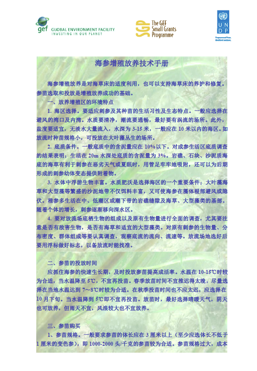 全球環(huán)境基金小額贈款計劃中國項目于2013年9月至2015年9月支持中國太平洋學會,實施“山東榮成楮島海草床修復與可持續(xù)利用示范項目”,該項目旨在通過海草床的修復和海珍品放牧相結合...