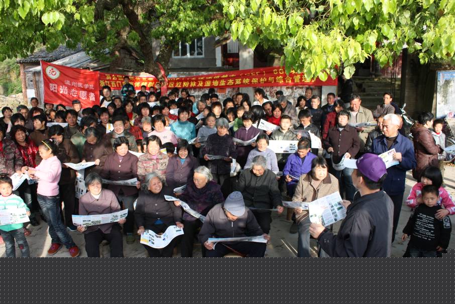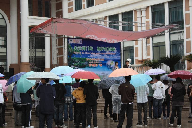 2010年4月22日是世界地球日,項目組在溫州醫(yī)學(xué)院同德樓廣場開展了一場 “關(guān)注西門島,保護(hù)紅樹林”宣傳活動。泰國國家科學(xué)博物館館長、泰國海岸帶環(huán)境行動計劃主席,溫州醫(yī)學(xué)院校長顧問披猜 ?宋成教授、浙江海洋水產(chǎn)養(yǎng)殖研究所副所長、項目組專家陳少波教授和溫州醫(yī)學(xué)院領(lǐng)導(dǎo)出席活動開幕儀式并致辭。本次活動在溫州醫(yī)學(xué)院向?qū)W生共發(fā)放《紅樹林濕地生物多樣性保護(hù)宣傳手冊》950份,展出“保護(hù)紅樹林濕地及生物多樣性”圖片展覽20多張,展出海洋貝類標(biāo)本20多種。