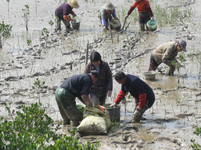 4月16日——19日期間,項目組成員,志愿者,及當(dāng)?shù)卮迕裨谡憬瓨非迨形鏖T島海洋特別保護(hù)區(qū)內(nèi)種植紅樹苗和插植胚軸(秋茄)30余畝,其中種植紅樹杯苗約1萬株,插植胚軸8.48萬株(秋茄胚軸1060㎏,約80株/㎏),參與村民達(dá)80多人次(其中婦人約占20℅)。