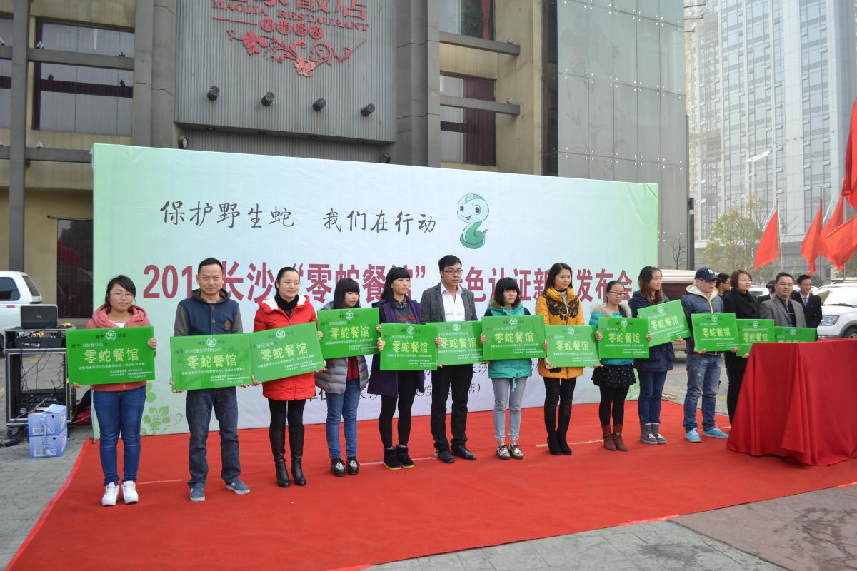 2013年10月—12月,協(xié)會(huì)組織志愿者共計(jì)50人次,聯(lián)合相關(guān)媒體進(jìn)行了8次大規(guī)模“零蛇餐館”宣傳活動(dòng)。志愿者們?cè)陂L(zhǎng)沙5個(gè)區(qū)1012家餐館張貼護(hù)蛇海報(bào)、派發(fā)護(hù)蛇宣傳資料和綠色餐卡,向食客和餐館老板廣泛宣傳野生蛇保護(hù)的重要意義、公民責(zé)任和法律義務(wù)。活動(dòng)期間向市民發(fā)放綠色餐卡共計(jì)5萬(wàn)份,同年12月6日,協(xié)會(huì)與長(zhǎng)沙市委宣傳部、長(zhǎng)沙市林業(yè)局、長(zhǎng)沙市文明辦舉行了“零蛇餐館”綠色認(rèn)證新聞發(fā)布會(huì)。現(xiàn)場(chǎng)對(duì)13家承諾不經(jīng)營(yíng)野生蛇的餐館頒發(fā)了首批“零蛇餐館”綠色認(rèn)證標(biāo)識(shí)。