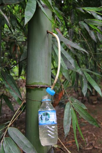 為使社員邊種竹子邊認(rèn)識(shí)竹子的多樣化利用,2014年8月7-12日,項(xiàng)目與縣林業(yè)局一起向全體合作社社員示范了竹子取水獲得“竹玉液”的過(guò)程。竹汁作為天然保健飲料,曾在 “中國(guó)?南亞博覽會(huì)(昆明)”上展銷,有較好的市場(chǎng)利用前景。社員們眼見(jiàn)為實(shí),進(jìn)一步增強(qiáng)了佤族社區(qū)發(fā)展竹產(chǎn)業(yè)的信心。