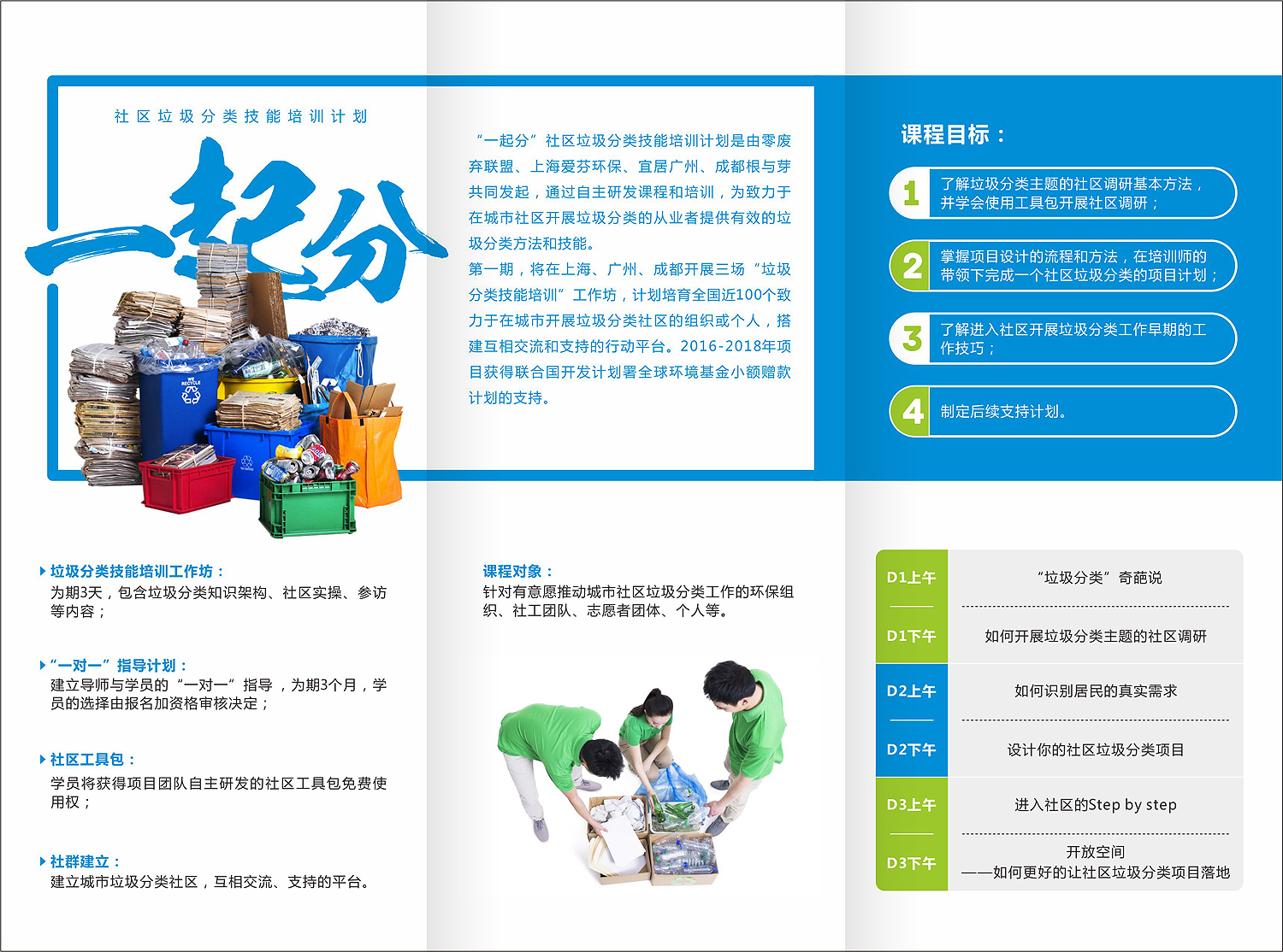 分區(qū)域垃圾分類經(jīng)驗推廣和技能培養(yǎng)項目由全球環(huán)境基金小額贈款計劃(GEF-SGP)資助資金292000 元,由北京自然之友公益基金會實施。“一起分”社區(qū)垃圾分類技能培訓(xùn)計劃是由零廢棄聯(lián)盟、上海愛芬環(huán)保、宜居廣州、成都根與芽共同發(fā)起,通過自主研發(fā)課程和培訓(xùn),為致力于在城市社區(qū)開展垃圾分類的從業(yè)者提供有效的垃圾分類方法和技能。第一期將在上海、廣州、成都開展三場“垃圾分類技能培訓(xùn)”工作坊,計劃培育全國近100個致力于在城市開展垃圾分類社區(qū)的組織或個人搭建互相交流和支持的行動平臺。